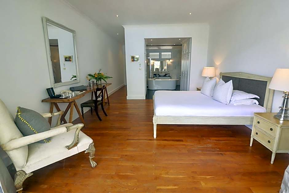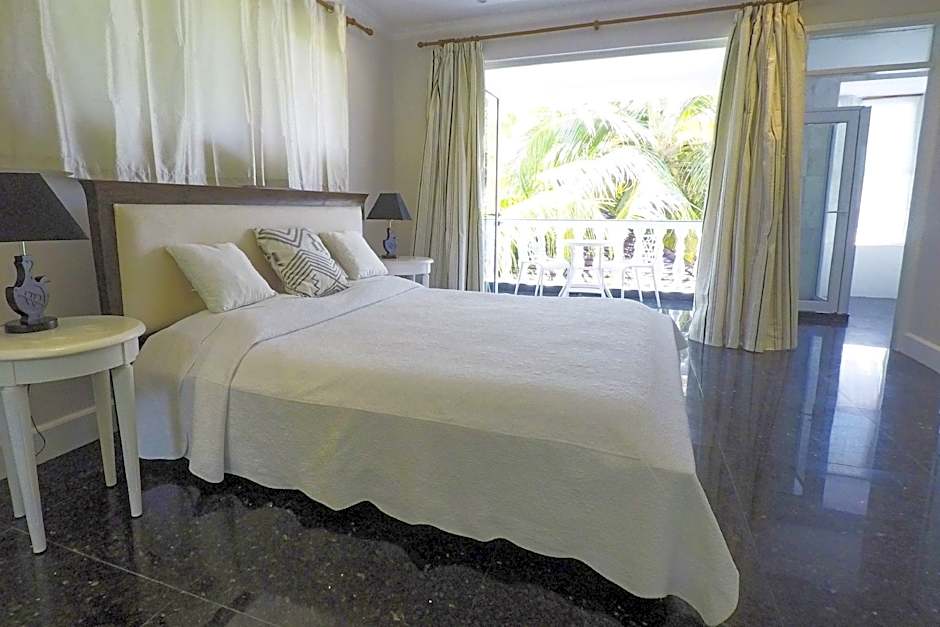 This spacious room opens onto a private balcony with views of the Beau Vallon national park mountains. The marble private bathroom has double ended bath, a double vanity and a large shower.