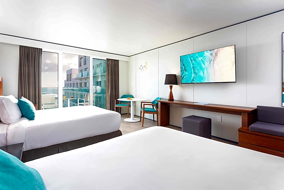 Brightly colored, well-equipped room with private balcony, offering breathtaking views of the Caribbean Sea and tropical pools. Includes designer bathroom amenities and cable TV.