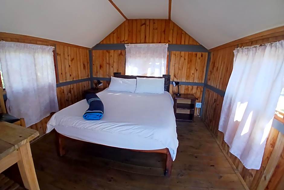 These wooden cabins have a shared bathroom, which is about 328 feet away.