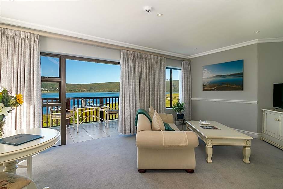 This suite features views of the Knysna Lagoon and includes a garden shower with deluxe bathroom amenities, a fireplace and private patio.