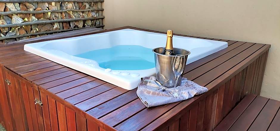 This spacious luxury suite has a garden with splash pool, a double indoor and outdoor shower, a heated outdoor jacuzzi ,a lounge area and a spa bath.
