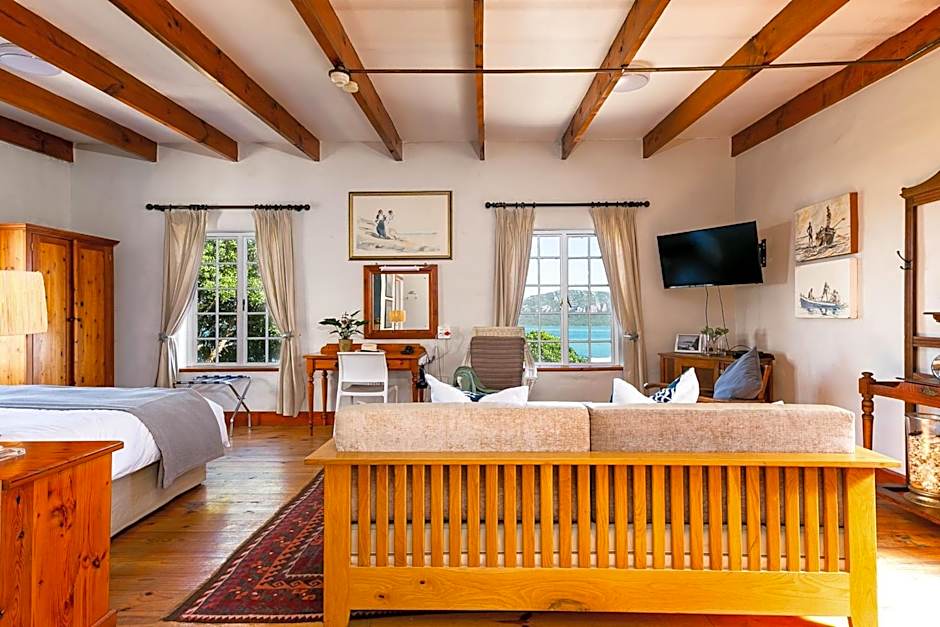 This large suite is located in the original farmstead, accessed by a staircase. It includes a main bedroom that leads into spacious lounge area with views of the lagoon. The private bathroom has a separate shower and bath.