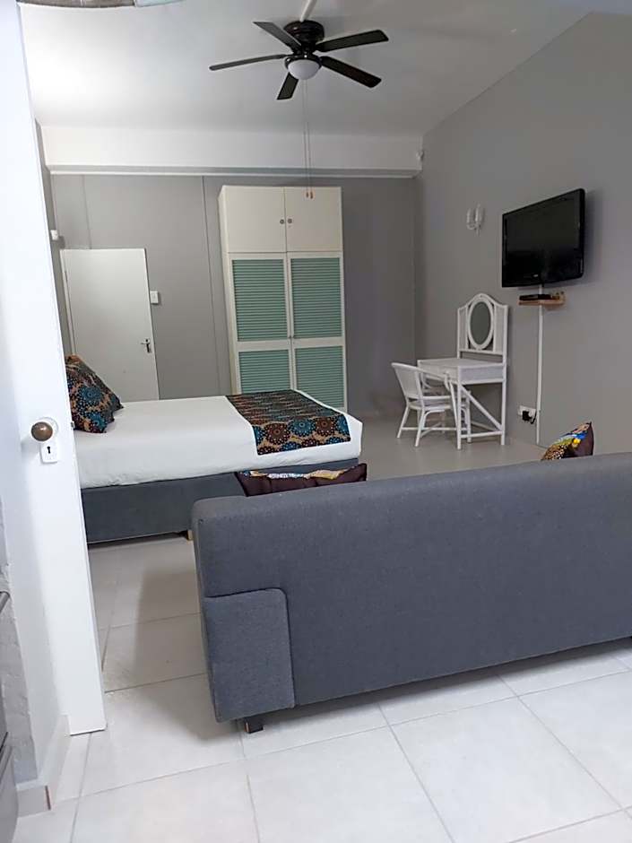 Fairway Guest Lodge offers a variety of rooms including Studio, Apartment, and Suite options. Occupancy ranges from 2 adults for the Studios and Suites to 4 adults for the Apartments. Smoking is not allowed in any of the rooms and bed sizes vary from Queen size to Twin beds. Room sizes range from 431 sqft for the Studio with Garden View to 1076 sqft for the Apartment with Sea View.