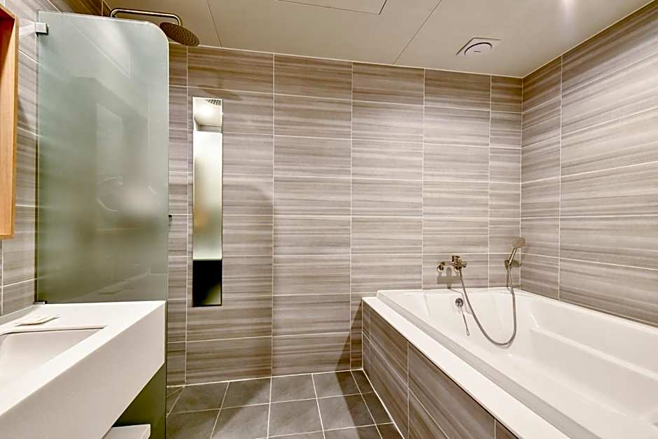 Address: 10, Sinhosandan 1-Ro 217beon-Gil, Gangseo-Gu. Minimum price starts from $44. Featured amenities include free private parking and Wi-Fi, room service, shuttle service (extra charges), spa tub, air conditioning, sun deck, terrace, soundproof and non-smoking rooms, wheelchair accessibility, elevator, free toiletries, a view, a bidet, and a bathtub.