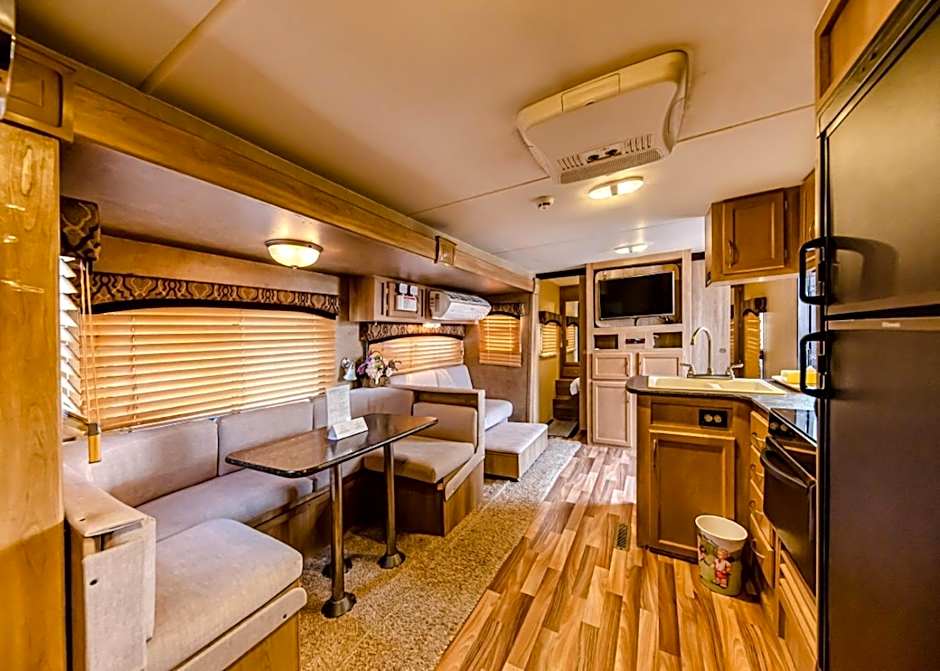 The mobile home has a private bathroom, air conditioning, soundproof walls, as well as a seating area with a flat-screen TV. The well-fitted kitchen features a refrigerator, kitchenware, a microwave and a tea and coffee maker. This mobile home offers a dining area and a TV. The unit has 4 beds.