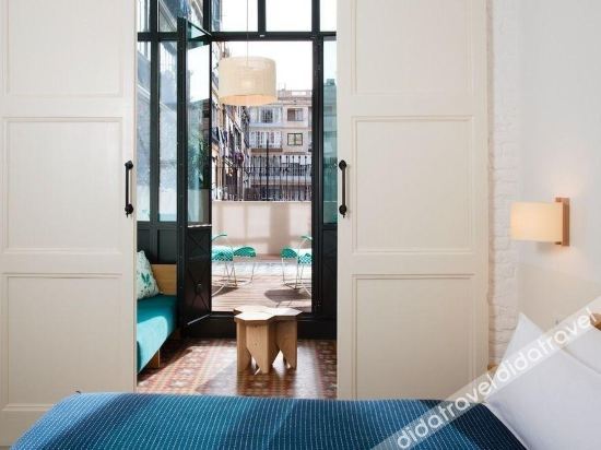 These rooms feature mosaic flooring and a gallery space with views of a characteristic Barcelona courtyard. A sofa bed, fan, and Smart TV are available. The bathroom includes premium toiletries, and a yoga kit is provided.