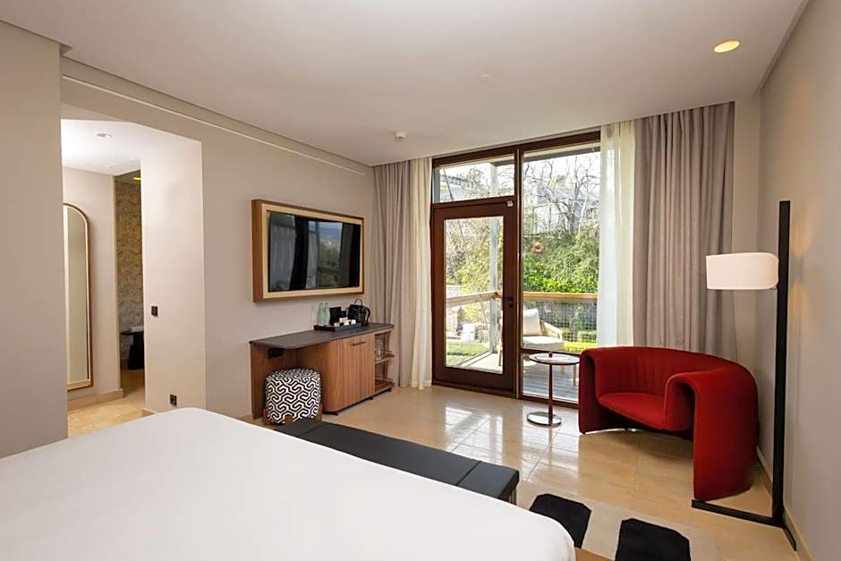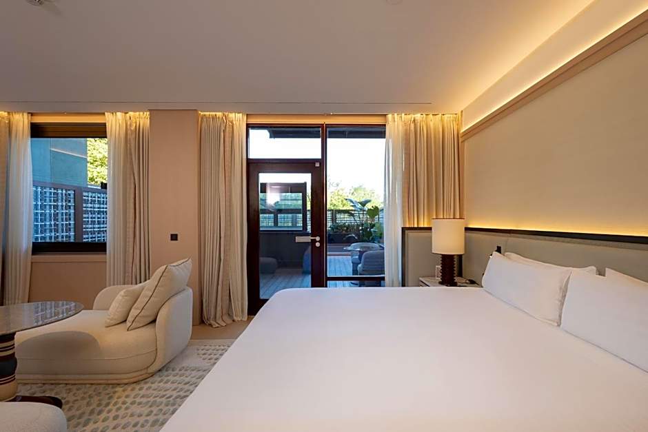 This spacious suite includes a separate lounge area and a private, furnished terrace with views over Barcelona and the Mediterranean Sea.