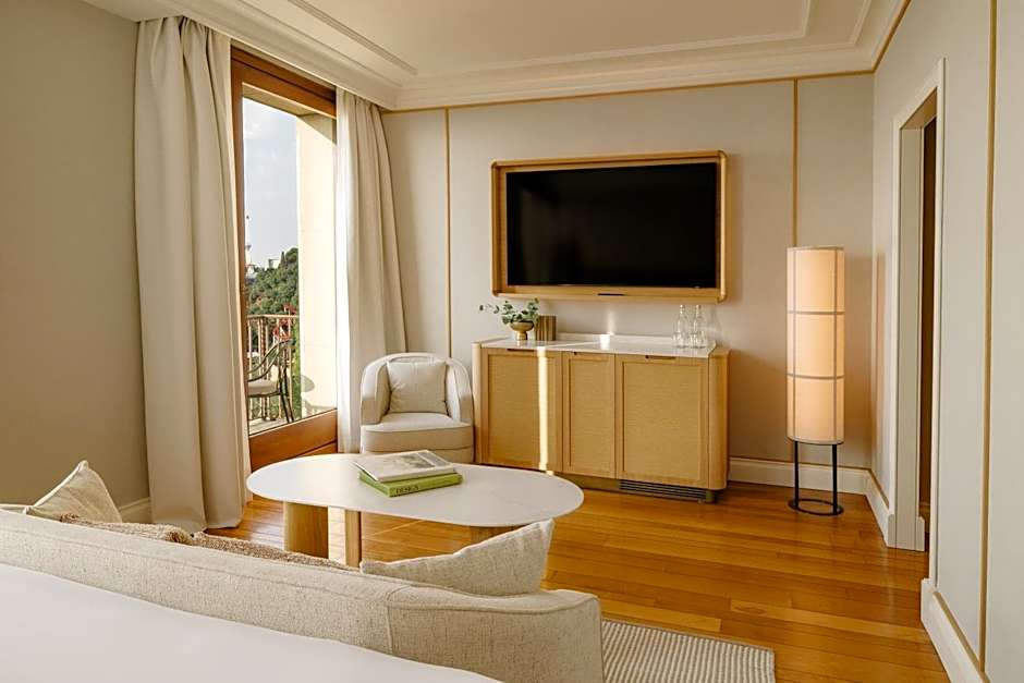 The spacious Junior Suite offers views of the surrounding hills. It comes with a separate seating area with a sofa.