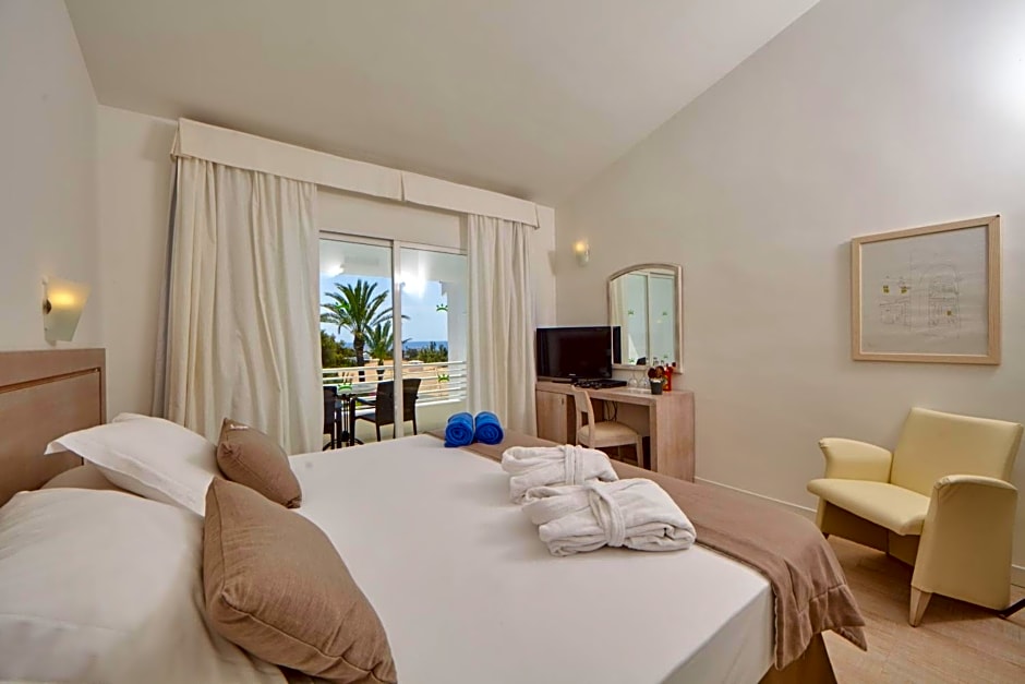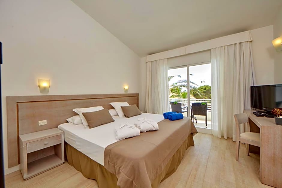 The two bedrooms Suite is designed for families with children, offering 2 separate bedrooms. Everything you need to fully enjoy Menorca with the family. The total surface is 51m2, distributed in a bedroom integrated into the living room, a second bedroom with two single beds, a spacious bathroom with a modern shower and a balcony to enjoy panoramic views of the hotel