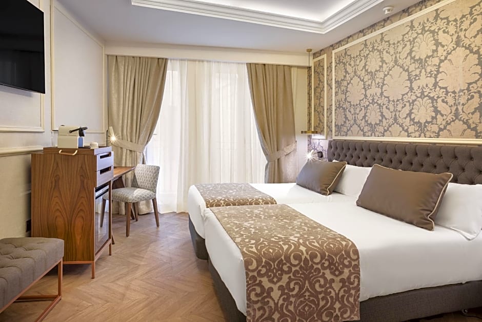 If you're traveling with children, the Triple Room is a great choice, accommodating up to three adults or a combination of adults and children. The room includes four twin beds and a double bed, ensuring everyone has a comfortable place to sleep. For smokers, there is a Double Room with Terrace available. This room features a queen-size bed and a private terrace where you can enjoy your morning coffee or an evening drink while taking in the views of Madrid.