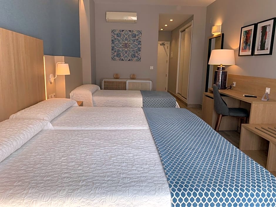 Hotel Puerta del Mar offers a range of room types including Double or Twin Rooms, Triple Rooms, and Superior Double Rooms. Smoking is not allowed in any of these rooms. The Double or Twin Rooms and Superior Double Room can accommodate 2 adults, while the Triple Room can accommodate 3 adults and 1 child. The Double or Twin Room and the Superior Double Room have 2 Twin beds and 1 Double bed, while the Triple Room has 3 Twin beds. Room sizes range from 215 sqft to 301 sqft.