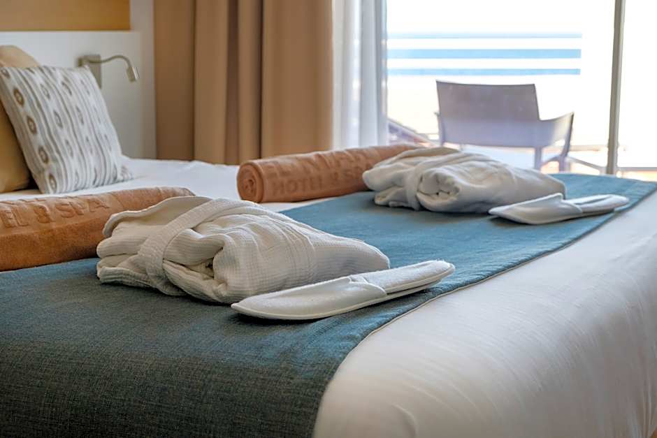 Indulge in comfort in our Double Room with Sea View featuring a private terrace and bathtub, offering breathtaking ocean views. Enjoy the convenience of a flat-screen TV, refrigerator, and air conditioning, making your stay even more enjoyable.