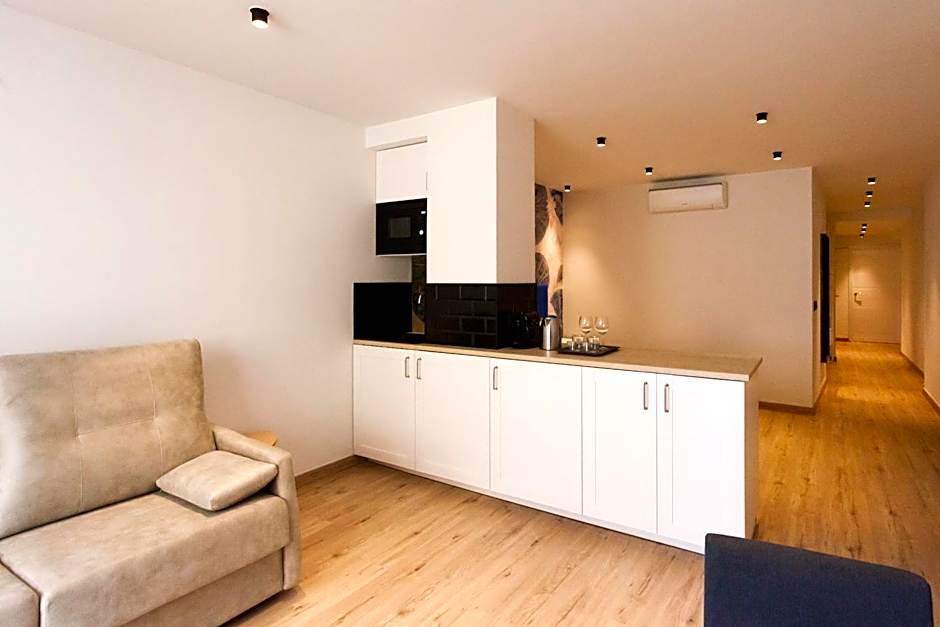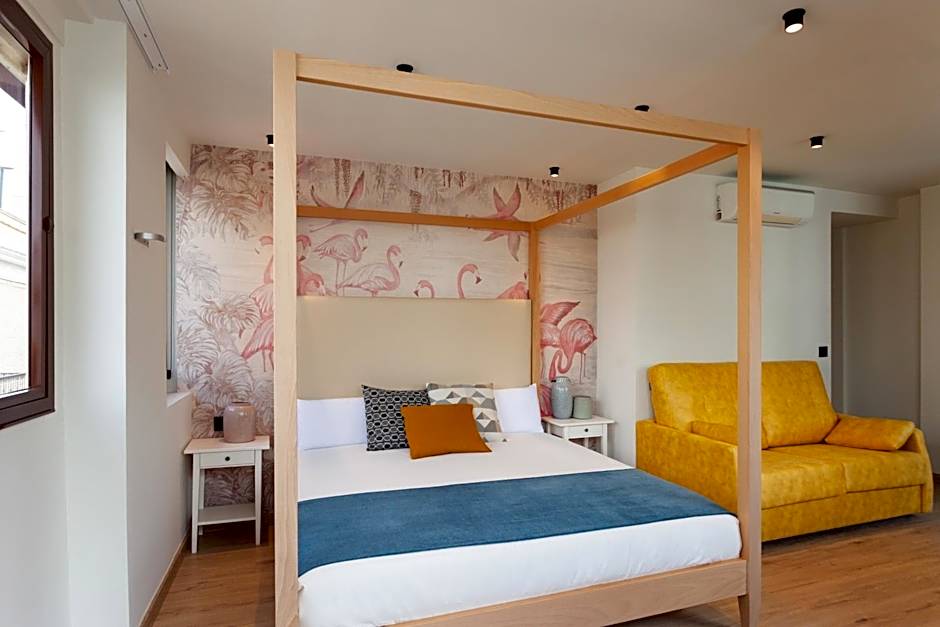 Room for 4 people. Window to the outside with views of Calle Sierpes, king Size double bed (180x2m) with canopy and 140x190cm sofa bed, private bathroom with hydromassage bathtub and Italian shower (with hair dryer, and free amenities), kitchen area and dining table (with microwave, Nespresso coffee machine, electric kettle, sandwich maker, refrigerator and kitchenware. Air conditioning and heating. Flat screen TV. and Free Wi-Fi.