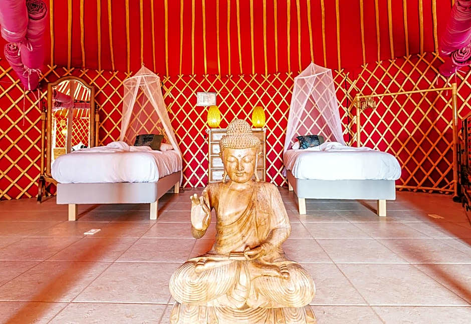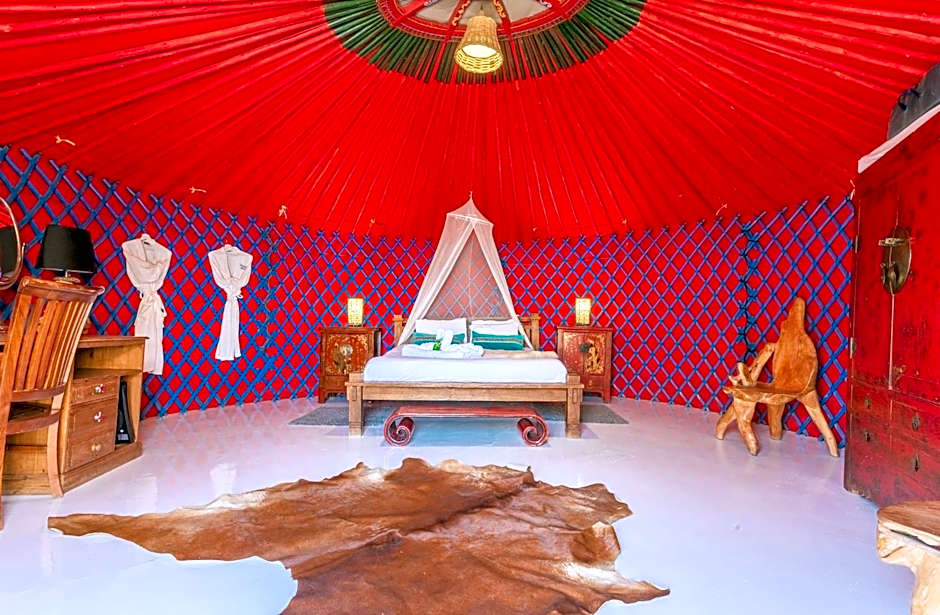 These eco-friendly luxury yurts consist of two adjacent Mongolian yurt pods. The yurt features a patio, a barbecue, a fully equipped kitchen, dining area and Bluetooth Speaker. A shaded day bed is also available.