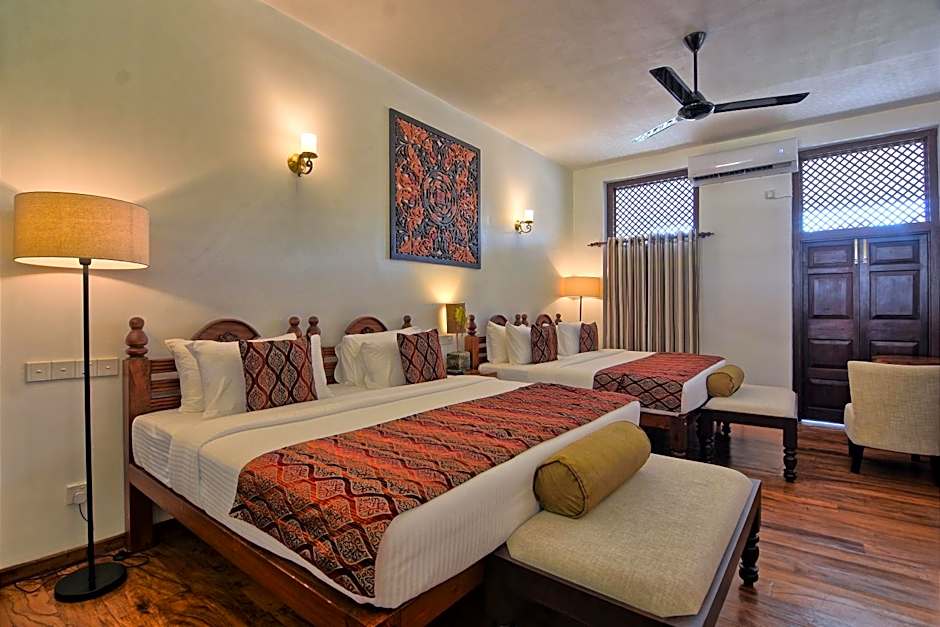 The Heritage Hotel Galle Fort offers a variety of room types including Superior Triple Rooms, Superior King Rooms for single occupancy, and Deluxe Twin Rooms for single occupancy. The rooms are non-smoking and each has a size of 291 sqft. The rooms can accommodate up to 3 adults and 1 child and have a combination of twin and double beds.