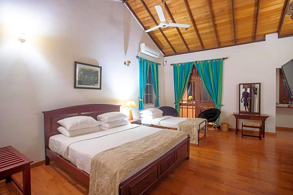 The Kandyan Villa offers a variety of room types including Deluxe Triple, Deluxe Double with Balcony, Deluxe Twin, and Three-Bedroom Bungalow. Smoking is not allowed in any of the rooms. The Deluxe Triple room accommodates 3 adults and 1 child, with a Twin bed and Queen size bed. The Deluxe Double and Deluxe Twin rooms both accommodate 2 adults and 1 child, with a Queen size bed in the former and 2 Twin beds in the latter. The Three-Bedroom Bungalow is spacious, accommodating 9 adults and 3 children, with 3 Queen size beds.