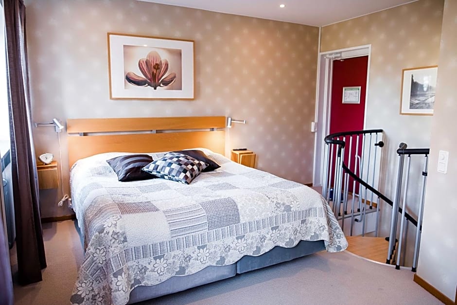 This suite has 2 floors connected with a spiral staircase. The upper floor features a double bed and a bathroom including a spa bath, bathrobe and slippers. Downstairs there are a seating area, mini-bar and an additional toilet.