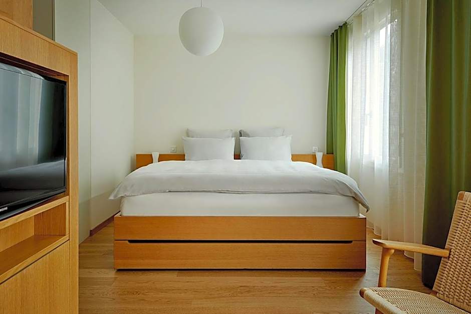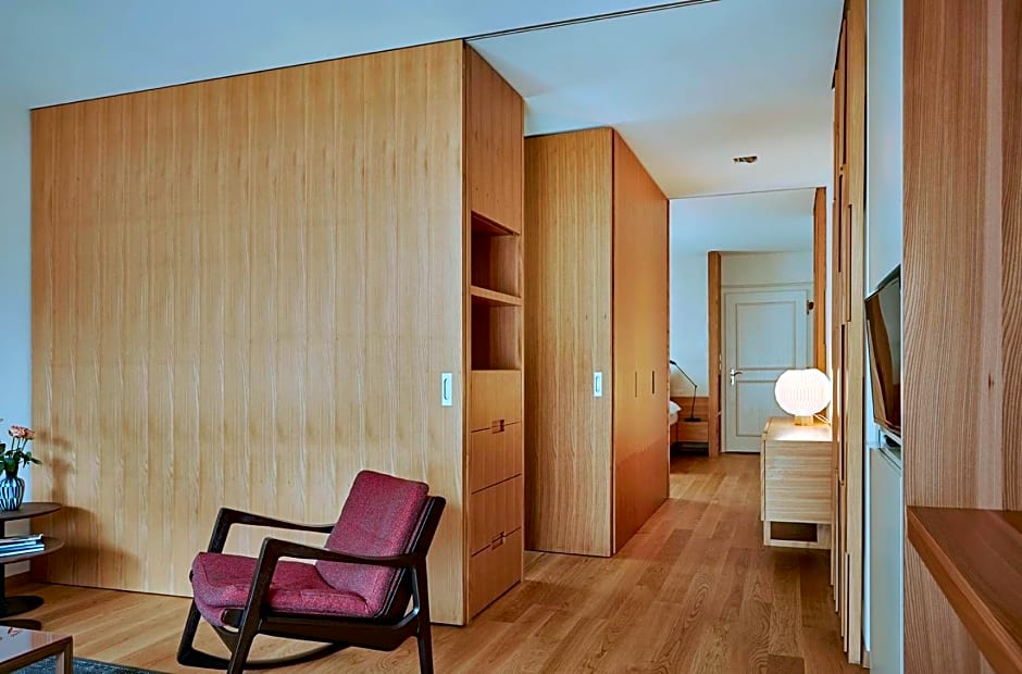 This south-facing room comes with a balcony, offering views of the surrounding mountains, and a high-quality Swiss box-spring mattress. It is fitted with classic furniture and high-quality materials.