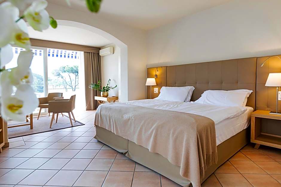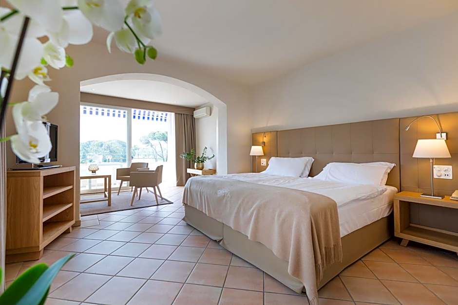 South-facing suite in the main building, with a bedroom, a living room, and 2 balconies overlooking the subtropical park with the outdoor pool and the tennis courts.