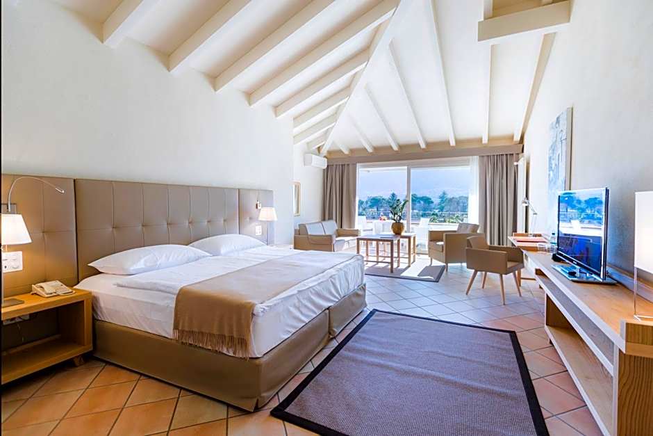 South-facing room on an upper floor in the main building, with a living area and a balcony overlooking the subtropical park and the outdoor pool.