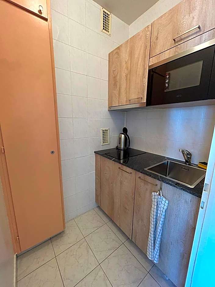 The studio has a double bed, private bathroom, TV and fully-equipped kitchenette.