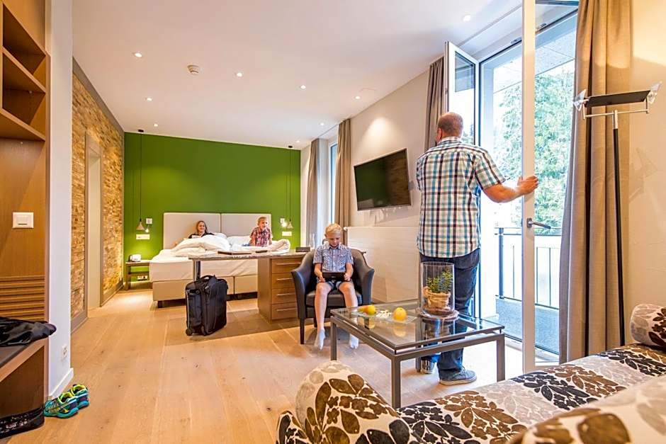 Spacious family room for up to 5 people. It consists of a living room, a bedroom with seating corner, bath and WC, separate children's bedroom with bunk beds, shower and WC. Partly with parquet flooring and boxspring beds, free WiFi, coffee and tea making facility, room safe, hairdryer, cosmetic mirror, bathrobes and slippers. The room is nonsmoking and the balcony has a beautiful view of the Wetterhorn and the Belvedere garden.