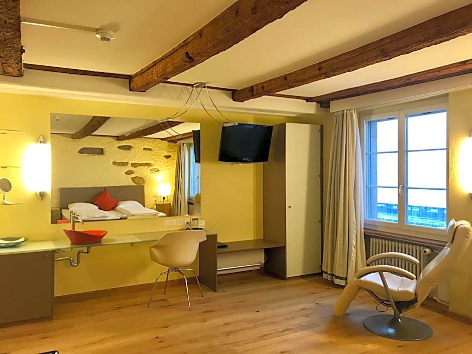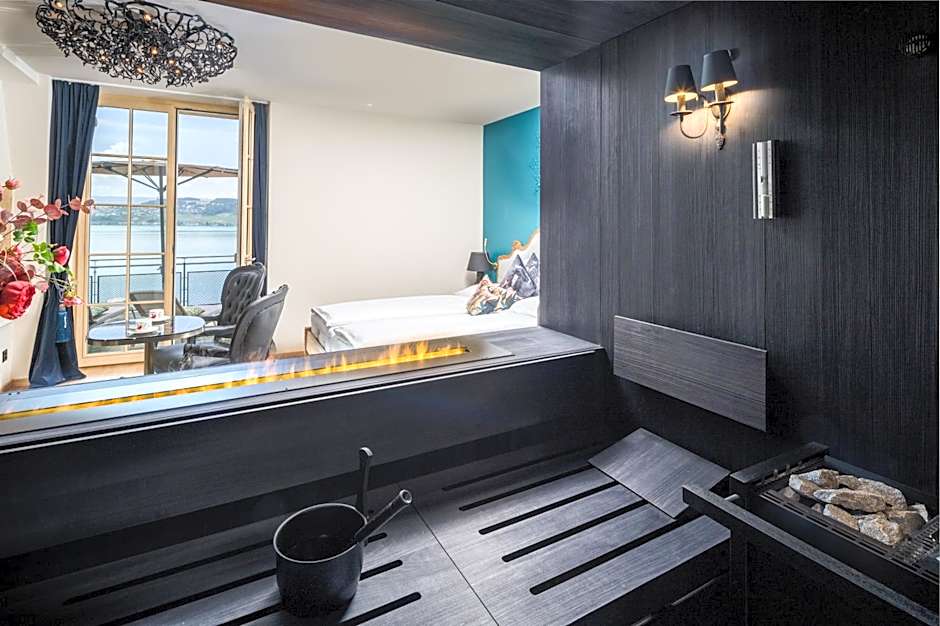 Very large suite with an integrated seating area and views of Lake Murten. All units are individually furnished, and equipped with an HD TV