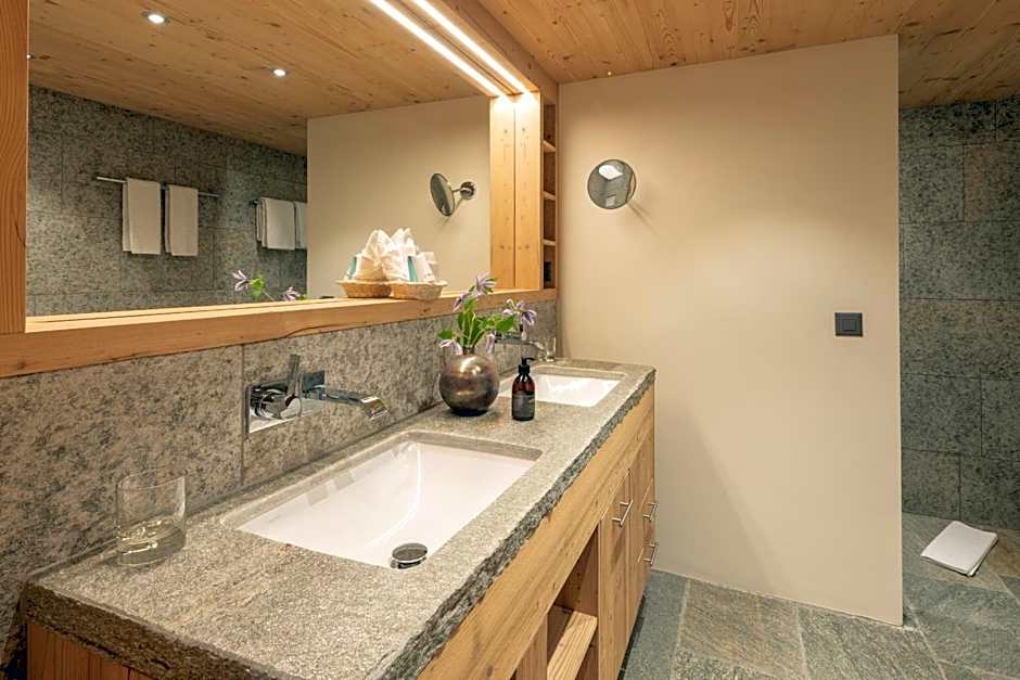 Spacious room with a balcony and views of the Piz Languard Mountain or the valley. The room features wooden floors and furniture made of Arven wood.