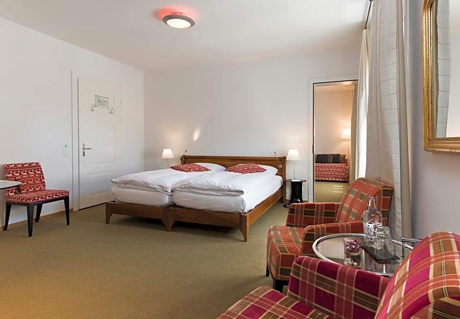 Modern, south-facing family room with views of the hotel park and the Roseg Valley. This room is located in the Art Nouveau wing and consists of a spacious room with an integrated living area as well as a bathroom.