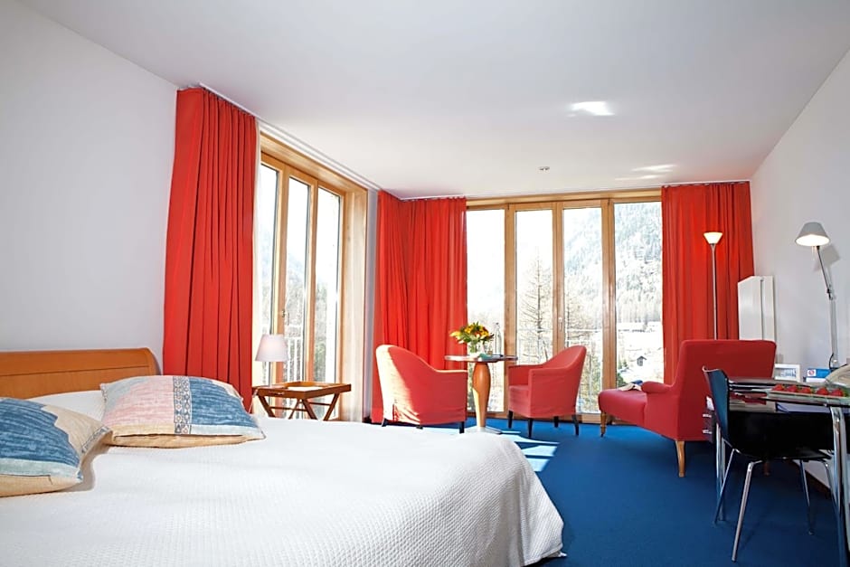 Modern and spacious corner room in the Ela Tuff wing. This south-facing room offers views of the hotel park and the Roseg Valley.