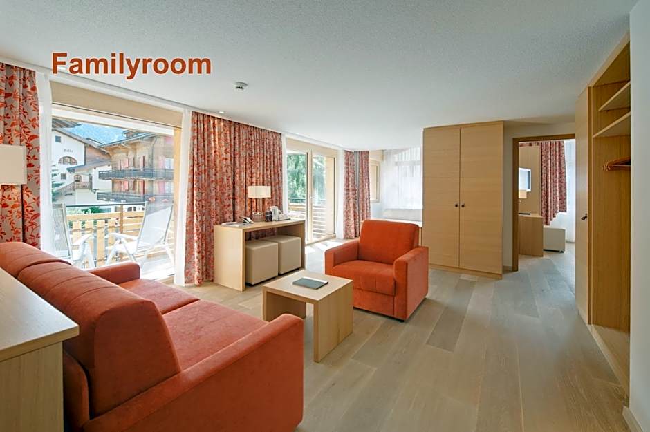 Large suite with a south-facing balcony offering views of the Matterhorn Mountain. It comes with a double bedroom, a bedroom with a bunk bed and a living room with flat-screen HD 32-inch cable TV, MP3 connection, room safe (36/19/16 in), hardwood floor and tea/coffee making facilities.