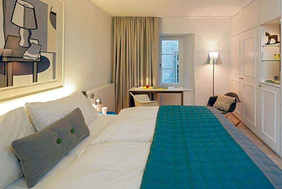 The room with wooden floors and modern furnishings offers views of the Cathedral and the pedestrianized Oberdorfstrasse. It features a private bathroom with a bathtub.