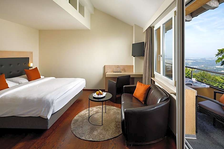 This suite doesn’t face the city but the Albis hills, the forest and mountains. The suite has a large balcony with a panoramic view, an oval spa bath as well as a starry sky design above the bed. All rooms are equipped with electric kettle and coffee machine.