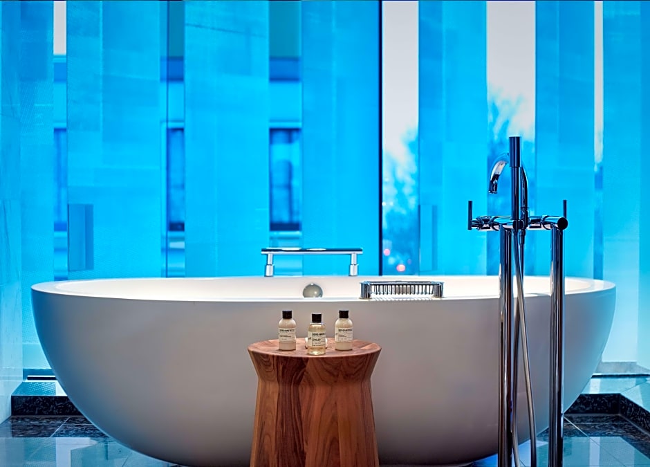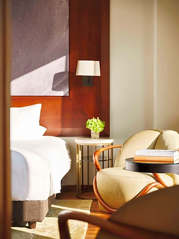 The spacious 2-Bedroom Park Corner Suite features an exclusive space offering ultimate comfort when traveling with family or in a group. The elegant Park Corner Suite features remarkable city views through floor-to-ceiling windows. Its bedroom and living space are separated by a floating cherry wood library and sliding doors. The interconnecting Twin Room, separable via a connecting door, is equipped with two single beds. The suite includes elegant bathrooms each equipped with walk-in rain shower and bathtub, one of which being a sculptural freestanding one. Personalized service begins with in-room check-in, fresh flowers, a daily fruit basket and mineral water, and continues through to an evening turn-down service