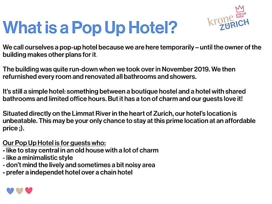 Should you choose to stay at Pop Up Hotel Krone Zürich, the doors are open for check-in between 15:00 and 19:00. Kindly check out by 10:00.