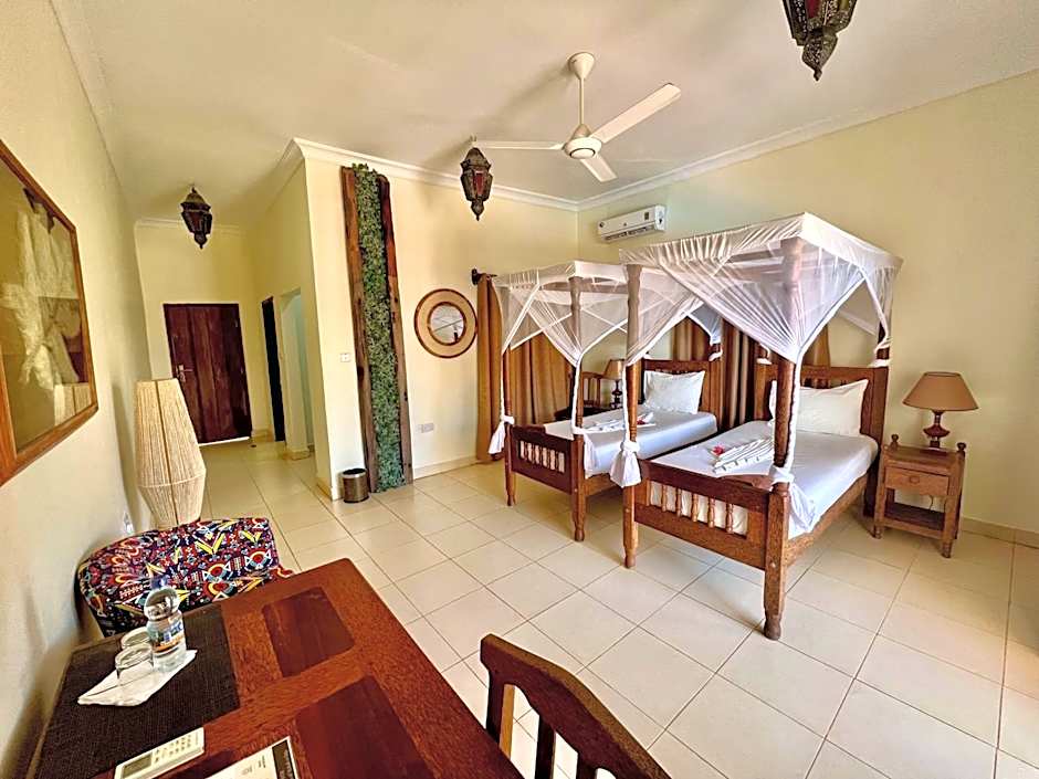 Set on the sun-kissed shores of Paje Beach in Tanzania, this beachfront escape invites travelers to step from a private beach area directly onto the sand and into an inviting outdoor pool for a refreshing dip. A terrace with garden or sea views, air conditioning, and private parking (free) keep comfort close at hand, while free Wi-Fi lets moments by the water turn into memories to share.