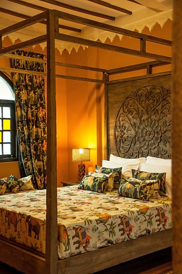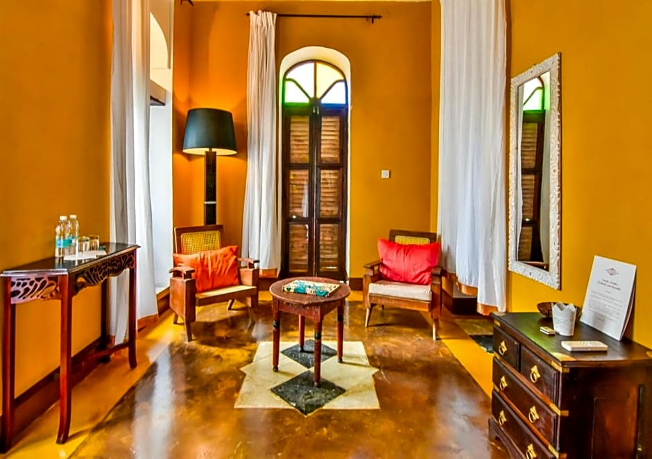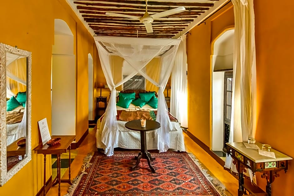 This spacious, air-conditioned suite features a balcony with views of the sea and old town, along with a seating area, Swahili-influenced décor and a large bathroom with a gold-stained bathtub.
