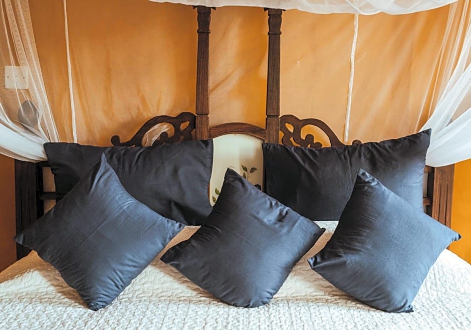Individually decorated, air-conditioned room with a ceiling fan, mosquito net and tiled bathroom.