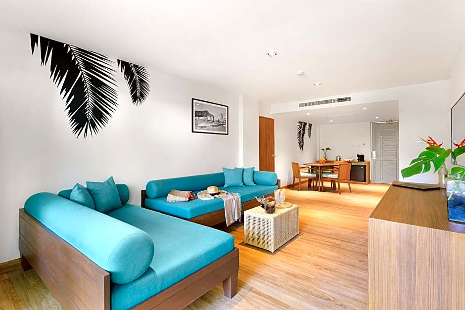 Spacious rooms with terrace, featuring king bed, dining area, bunk beds and kids play area.