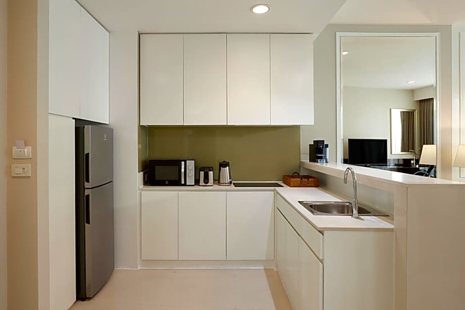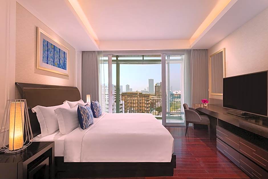 Suite comes with spectacular views over the Royal Bangkok Sports Club and Lumpini Park from private balconies in both the living room and bedroom. It features a kitchenette and spacious living area. Two 32-inch flat-screen satellite TVs are provided in rooms.