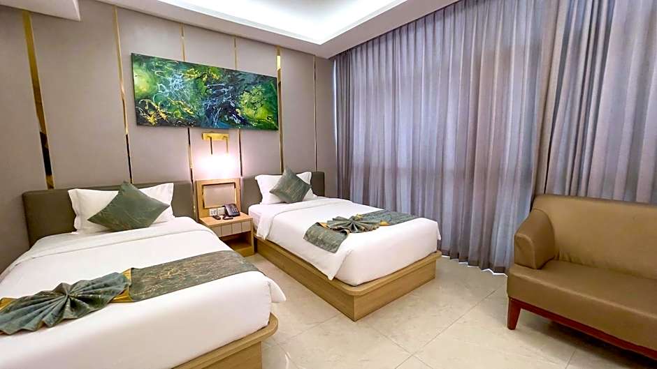 The Elegant Airport Hotel offers Triple Rooms which can accommodate 3 adults with 1 Twin bed and 1 Double bed, and Standard Twin Rooms which can accommodate 2 adults with 2 Twin beds. Both room types have a room size of around 366-388 sqft and are non-smoking.