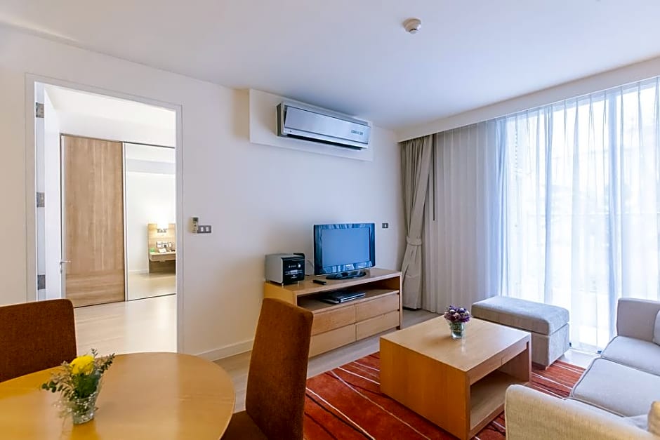 The 1-bedroom suites feature a combined living and dining area with a large open kitchen and a separate bedroom. The bedroom offers a king-sized bed, a work desk and a wardrobe. It has a walk-in rain shower and is also fitted with a washer-dryer. Some units include a separate bathtub. The living room has a sofa, arm chairs, a coffee table and a TV. Kitchen amenities include a stovetop, microwave, kitchenware and other necessities.