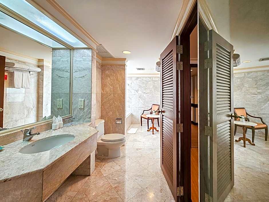 Spacious suite features 2 bedrooms, living room, work desk, sofa, dining table and kitchenette facilities. Enjoy views of Bangkok from master bedroom and the Sky Tower from the bathroom.