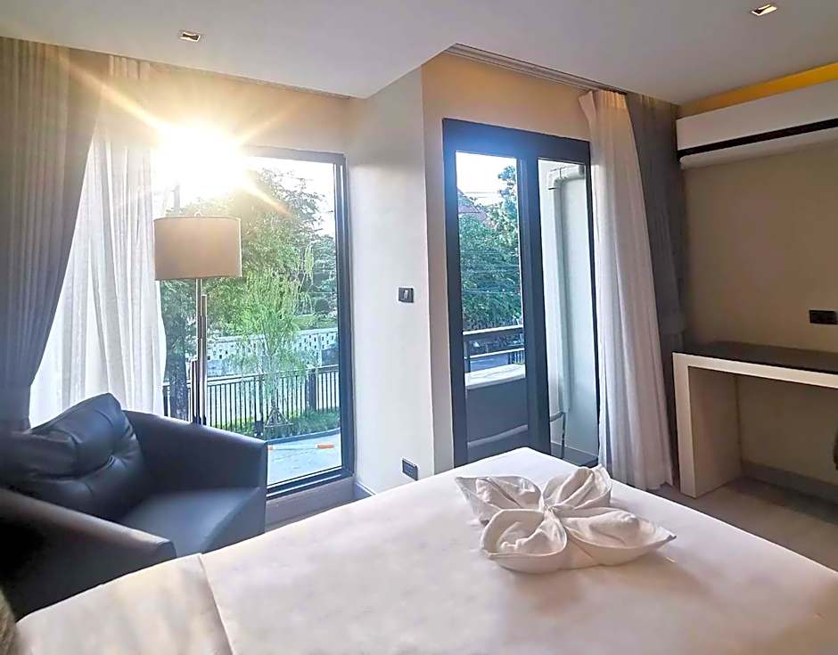 Upper floors are accessible by elevator, and a balcony with a view provides a relaxing spot after a day in Bangkok.