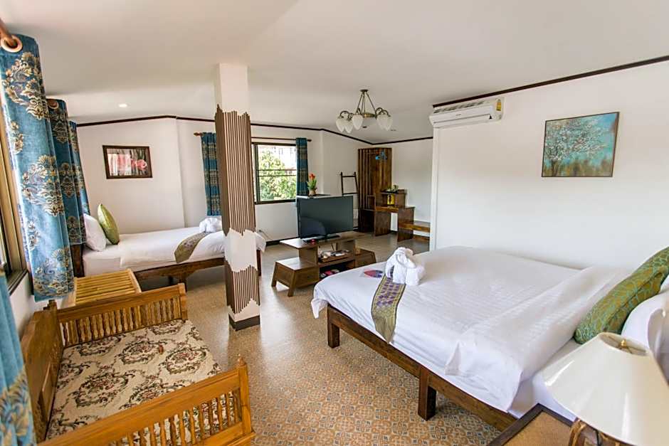 Providing free toiletries, this family room includes a private bathroom with a shower, a hairdryer and slippers. The family room features tiled floors, a seating area with a flat-screen TV with satellite channels, air conditioning, a dining area, as well as an electric kettle. The unit offers 2 beds.