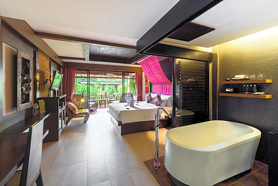 Spacious room features a glass-walled bathroom with a spa bathtub and outdoor seating at the balcony.