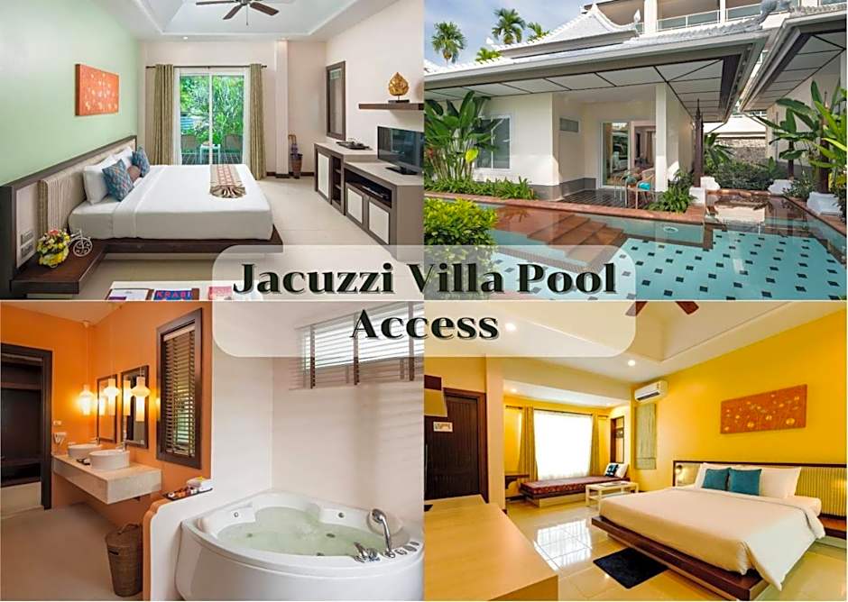 Surrounded by a tropical garden, this Thai-style villa consists of a separate living area with a sofa and multimedia, a well-equipped dining area and an a spacious private bathroom along with a spa bathtub.