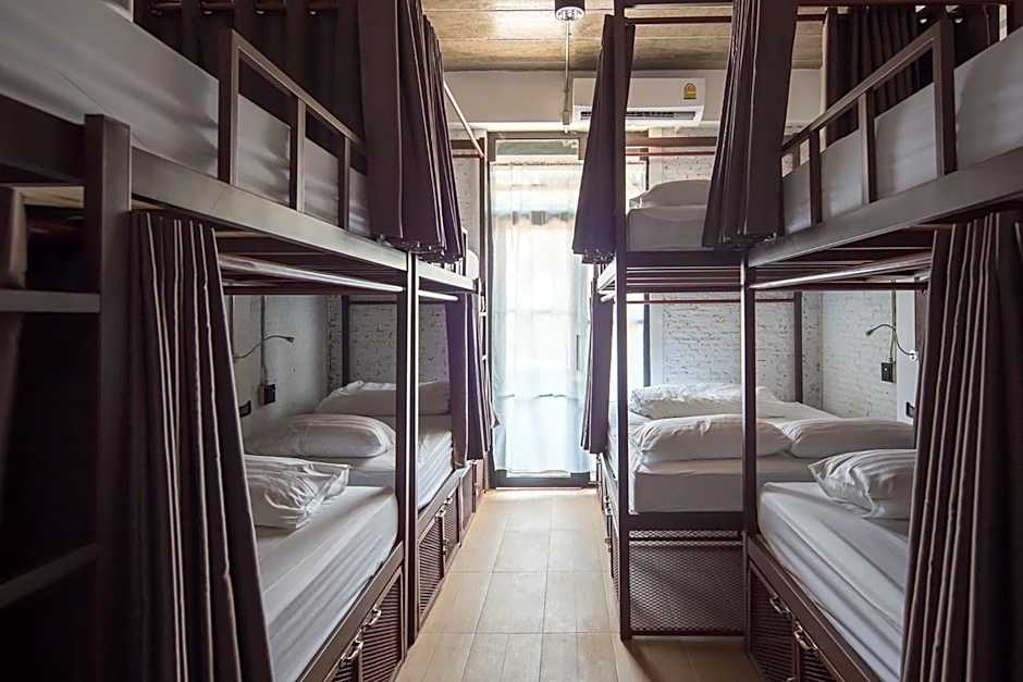 Yindee Travellers Lodge offers various room types such as Mixed Dormitory Rooms with bunk beds for single guests, Family Rooms with multiple bed options for groups of up to 10 adults, Twin Bunk Bed Rooms for 2 adults, and Double Rooms with private bathrooms. Smoking is not allowed in any of the rooms. Bed sizes range from twin, double, to queen beds, accommodating different numbers of guests.