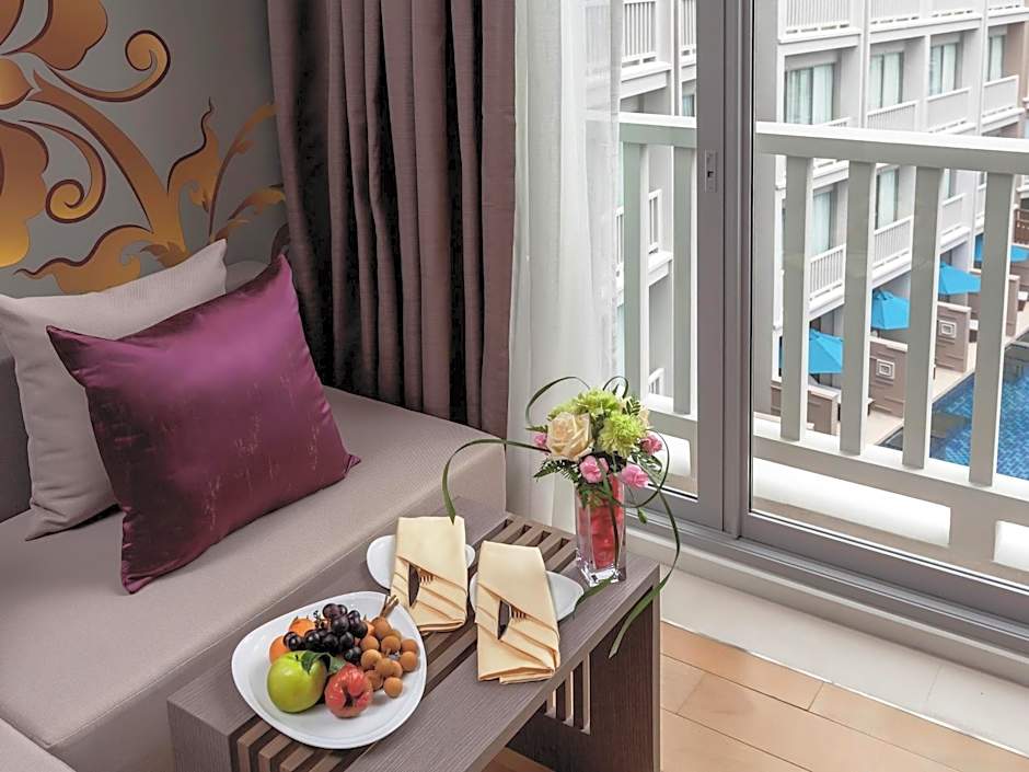 The spacious suite offers air conditioning, a mini-bar, a balcony with pool views as well as a private bathroom featuring a bath.