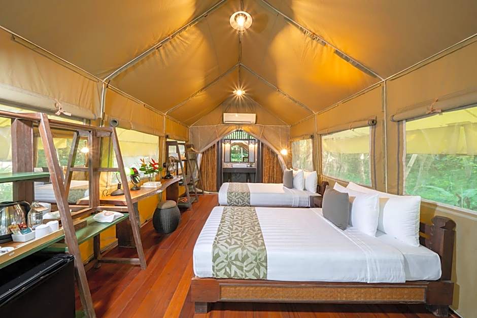 Accommodations come in a mix of tent and standard options, including Deluxe Tent with King/Twin and Private Bathroom, Deluxe Tent with Private Bathroom, Superior Tent, Deluxe, Deluxe Tent, Triple, and Executive styles. Some configurations accommodate couples or small families, with various setups designed to suit different travel plans while keeping close access to the riverfront atmosphere.